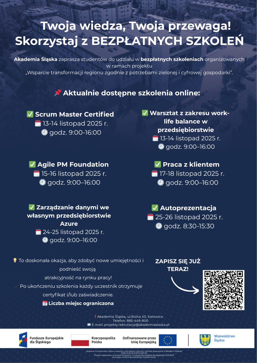 Zapraszamy do udziału w bezpłatnych szkoleniach/warsztatach organizowanych w ramach projektu „Wsparcie transformacji regionu zgodnie z potrzebami zielonej i cyfrowej gospodarki w Akademii Śląskiej”, realizowanego z Programu Fundusze Europejskie dla Śląskiego 2021–2027 (Fundusz na rzecz Sprawiedliwej Transformacji).