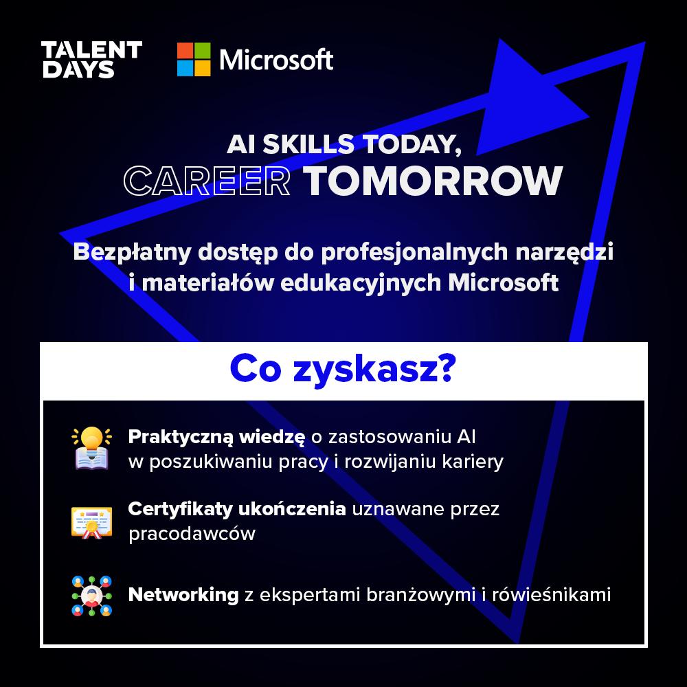 Microsoft i portal kariery dla młodych Talent Days zapraszają Was do udziału w programie "AI Skills Today, Career Tomorrow" - kompleksowej inicjatywie edukacyjnej, która pozwoli Wam zdobyć zaawansowane umiejętności z zakresu sztucznej inteligencji i skutecznie wykorzystać je w rozwoju Waszej kariery zawodowej.